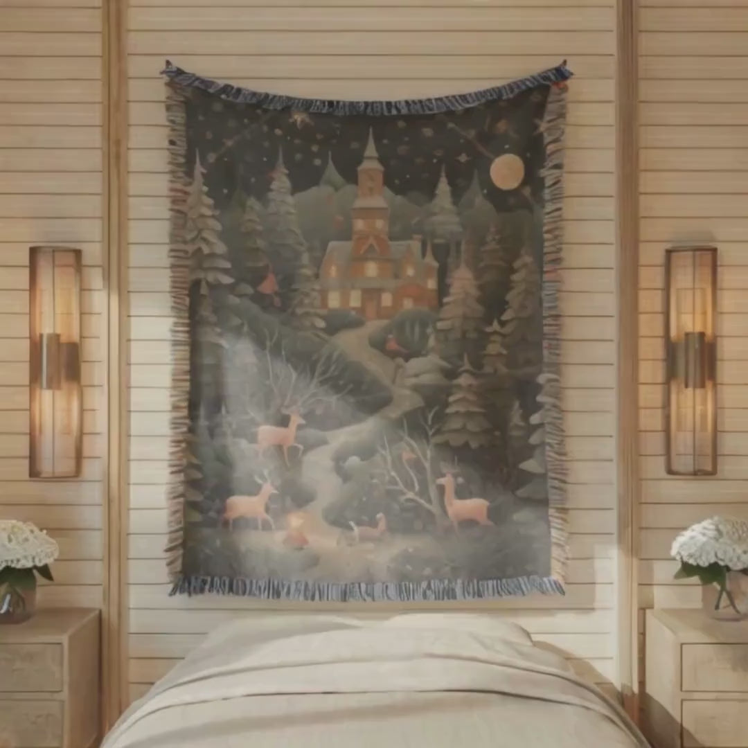 Made with handcrafted woven threads, the blanket showcases intricate details including a magical castle under the moonlit sky, surrounded by reindeer and lush Christmas tree tapestry motifs. The colorful fringed edges add a playful boho chic blanket accent that complements any festive room accent or winter forest throw setup. Available in three sizes, it fits perfectly as a throw for chairs, couches, or beds, making it versatile for decorating your home or gifting to loved ones.