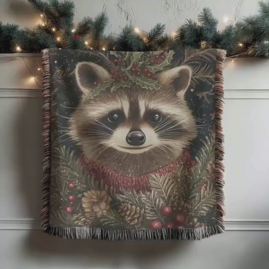 Xmas Racoon Tapestry - Cozy Woven Blanket | Woodland Animal Decor | Christmas Home Accent