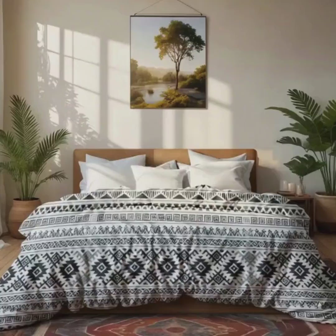 The geometric bedding set offers a modern duvet cover solution designed to refresh your bedroom decor update with style and comfort. This 3 piece bedding set includes a zippered duvet cover and two pillowcases, crafted from breathable polyester fabric that is soft and lightweight for all-night comfort. Available in twin size bedding, queen size bedding, and king size bedding, this black white duvet cover brings minimalist bedding elegance to any room.