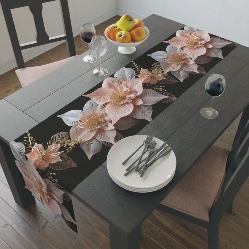 This poinsettia table runner blends festive charm with elegant design to elevate your holiday dining experience. Featuring a pink poinsettia design accented with shimmering gold, this holiday table runner creates a luxurious focal point for Christmas dinners and seasonal celebrations. Crafted from soft fabric runner material, it offers both comfort and durability, making it an ideal choice for holiday party accent and everyday festive dining decor. Measuring 16" × 72" or 16" × 90", this pink gold runner fits most dining room tablecloths perfectly, adding a luxury holiday decor touch that transforms your space.