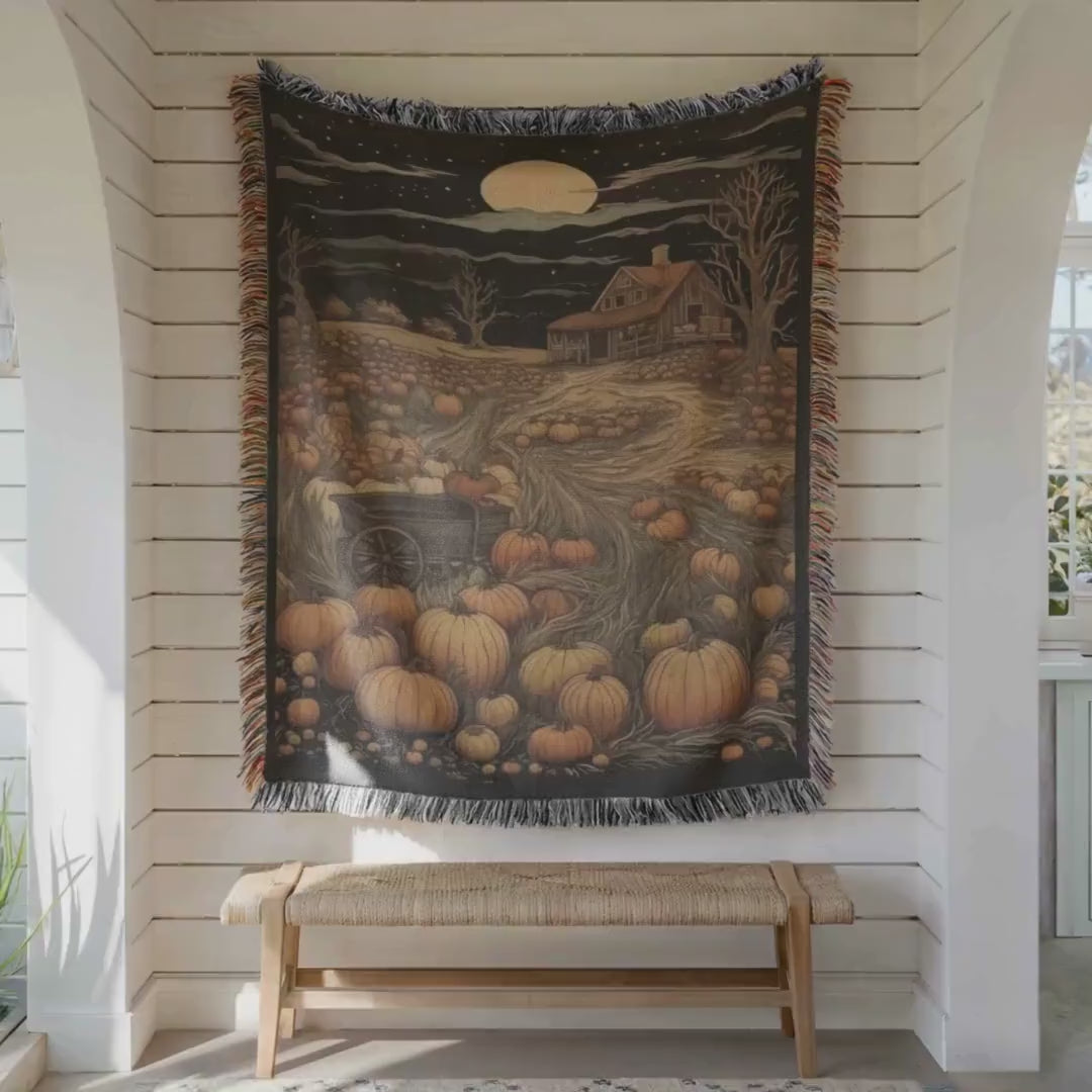 This harvest season throw brings the essence of autumn indoors with its warm tones and intricate woven design inspired by pumpkin patches under moonlight. The cozy farmhouse throw adds a rustic home accent that complements any autumn bedding accent or living room setup. Whether draped over your sofa or layered on your bed, this chilly night blanket enhances your seasonal home decor while providing comforting warmth.