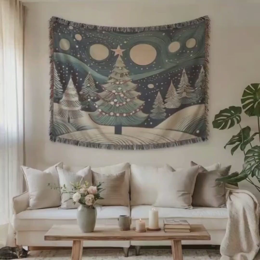 Bring warmth and holiday cheer into your home with this festive forest blanket—ideal as a Christmas tree throw or accent piece in any cozy cabin or rustic holiday decor setting. Its soft cotton yarn and customizable options make it perfect for gifting or personal use during the winter season.