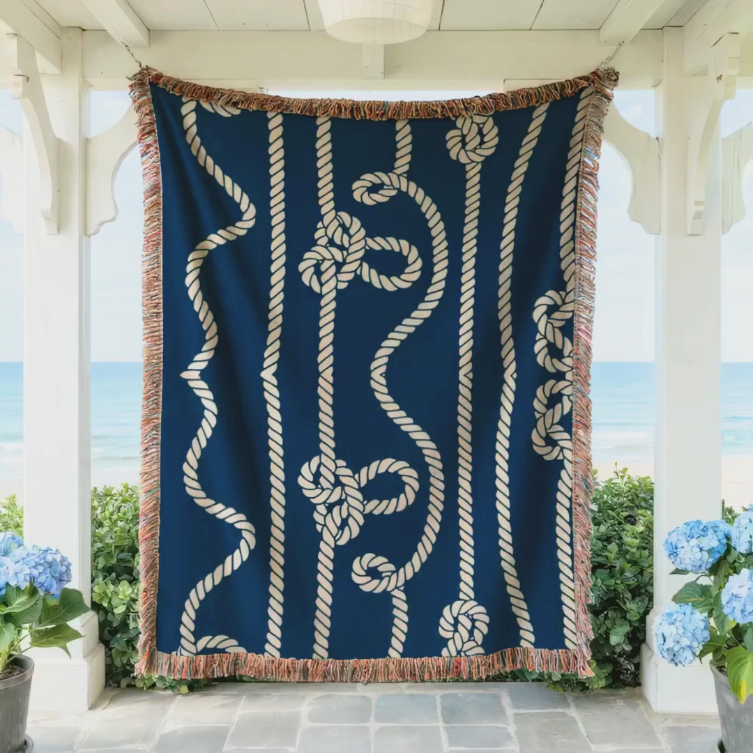 Marine Woven Blanket – Nautical Cord Throw With Colorful Fringed Edges